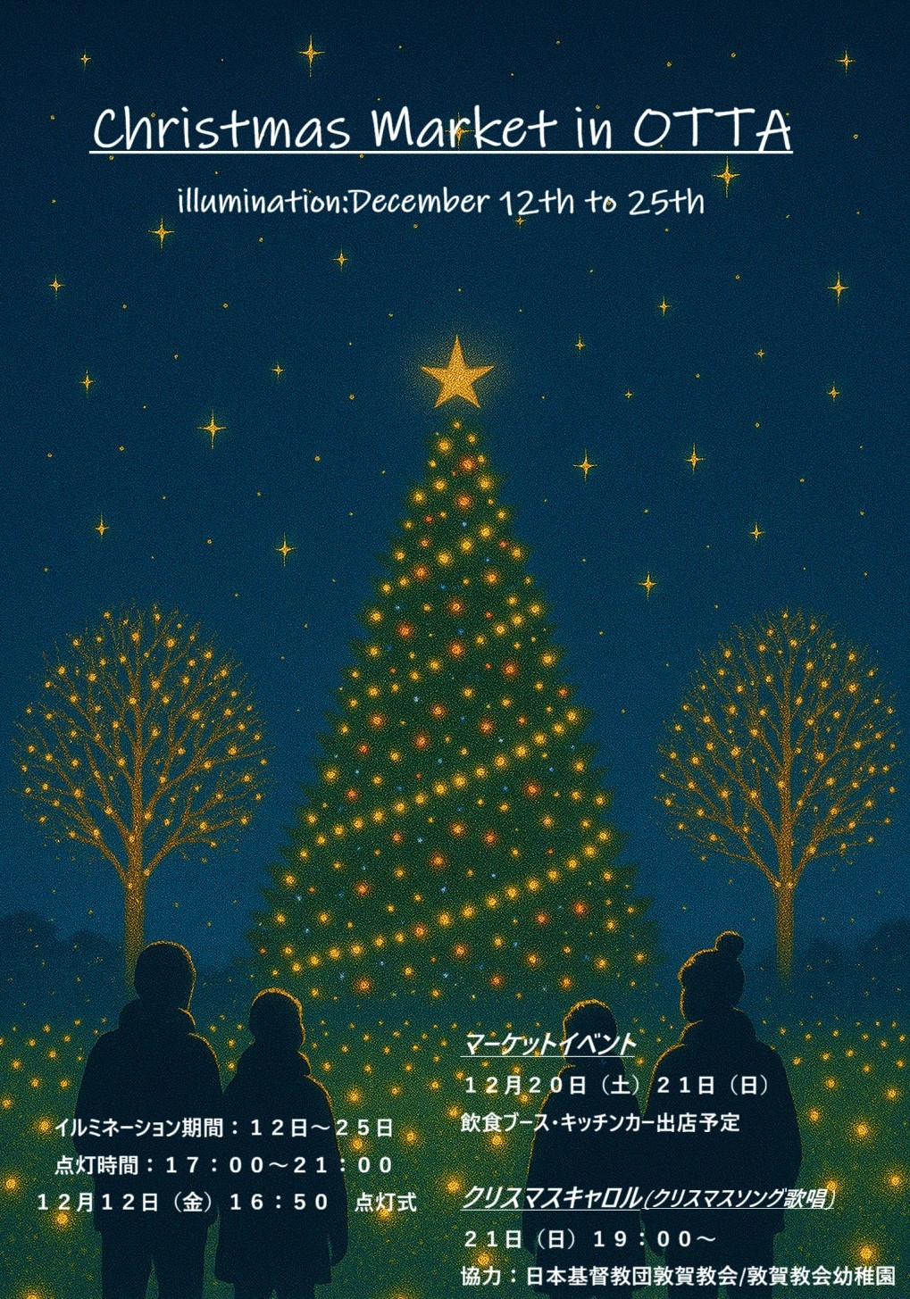 12月12日から25日まで、芝生広場にてイルミネーションを行います。クリスマス前の土日となる20日、21日には、飲食ブースやキッチンカーによるマーケットイベントを実施します。さらに21日には19時より、日本基督教団敦賀教会および敦賀教会幼稚園によるクリスマスキャロルの披露も実施します。