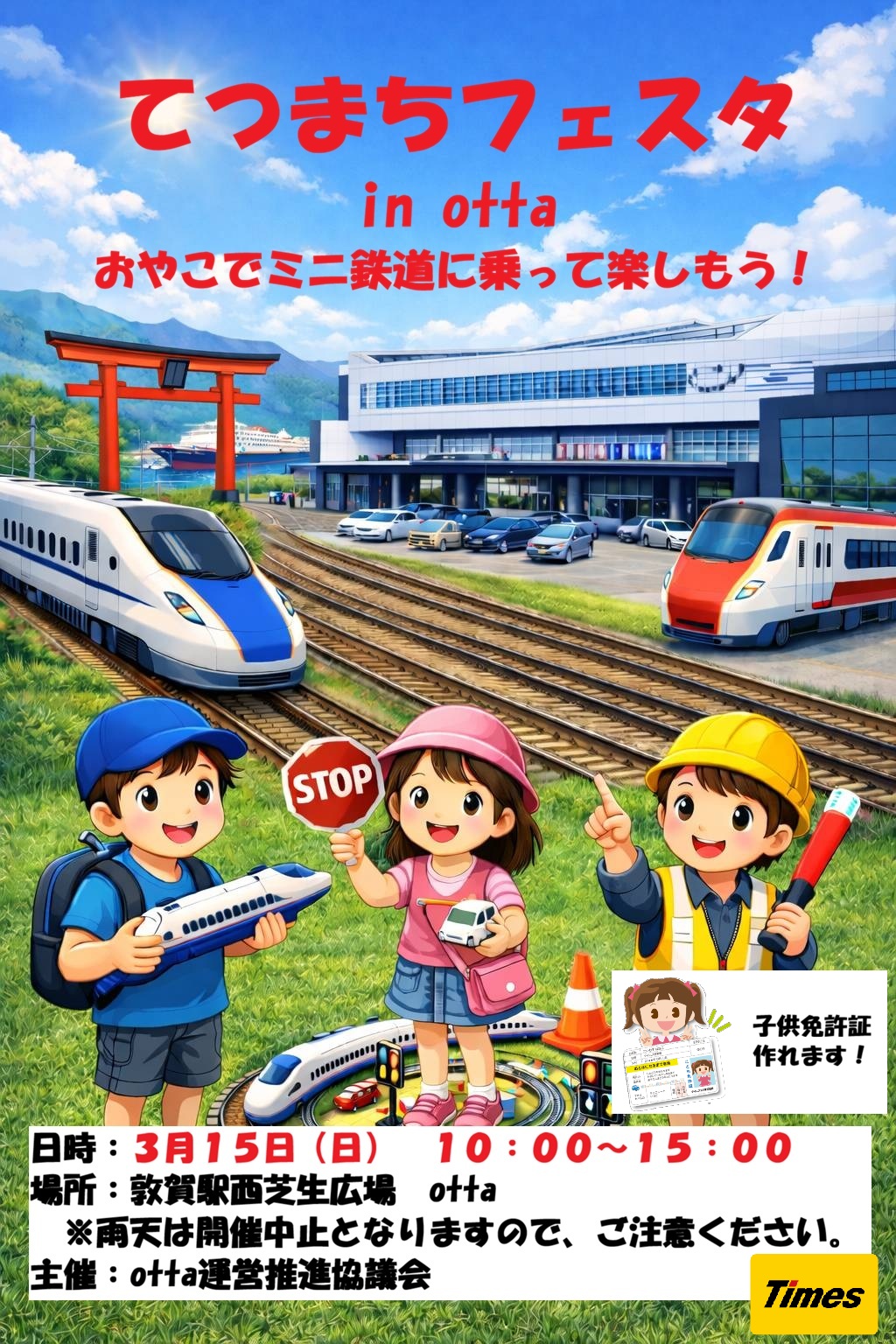 3月15日(日)に、芝生広場にててつまちフェスタを行います。広場周りにてミニ鉄道への乗車や、子供免許証の作成を実施いたします。